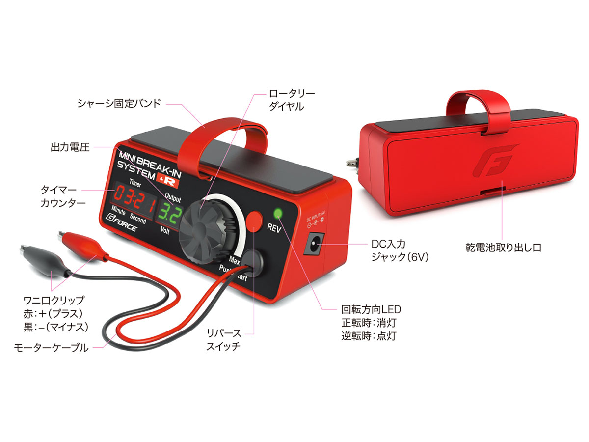 ボタンひとつで正転・逆転切替え可能。 新たに搭載されたリバーススイッチを押すごとに、モーターの正転と逆転の切り替えが可能に。 モーターの慣らし作業を、より簡単かつ効率的に行える様になりました。 最大6.0Vの高電圧ブレークインが可能。 最大6.0Vの高電圧がブレークインの幅を広げる。チョッパ制御による、0.1V刻みの設定値が高電圧から低電圧まで、緻密なブレークインを可能に。レーサーの望みを叶える、至高のブレークインシステム。 テスターで測った電圧と表示される電圧が違う? >(Gフォースさんのサイトへリンクします。) オフタイマー機能搭載 秒単位の設定で、望むがままのブレークインを可能に。正確な時間管理で、同一条件でのデータ取りにも最適。目指すコンディションに確実に仕上げるベストツール。 モーター単体でのブレークインも。 レース当日、支給モーターを最速コンディションに。発走直前の急なモーター変更にも余裕をもって対応。あらゆるシーンで、最大限のアドバンテージを。 場所を選ばない、多彩な対応電源。 単三電池4本で動作するので、電源のない特設コースでも使えます。大容量NiMHバッテリー(単三型)なら長時間の使用も可能に。別売の6V/2A ACアダプターを使えば、家庭用コンセントから安定した出力でお使いいただけます。 【特徴】 スイッチひとつで正転・逆転切り替え可能! モーター&ギアを効率的にブレークイン! ●モーター正転・逆転切替えスイッチを搭載 ●0.1V(最大6.0V)単位で好みの電圧に設定が可能 ●慣らし時間の管理に便利なオフタイマー機能 ●1/24~1/32スケールの電動模型に最適なサイズ ●ロータリーダイヤルでクルクル・ピッピッのカンタン操作 ●マジックテープ式ベルトでシャーシ・モーターを確実に固定 【付属品】 ●Mini Break-In System +R本体 ●DC入力ケーブル ●取扱説明書 【製品仕様】 ●電源…単三アルカリ乾電池 4 本(別売) 単三型充電電池 4 本(別売) AC アダプター6V/2A(別売) ●作動電圧…4.8〜6.0V ●サイズ…112(W)×47(D)×45(H) mm ●重量…105g(乾電池含まず) この商品に関するより詳しい情報はこちらをご覧ください。 (販売協力を頂いる株式会社ジーフォース様ののサイトへリンクします。) ※G-FORCE製品の出荷は、ご注文確認後2日〜5日程度頂く場合があります。予めご了承ください。 定価5,400円のところ オンラインショップ特別価格4,320円 |