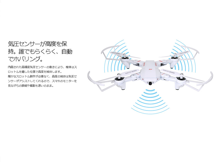 持ち運びに便利なアーム可変式、フォルダブルドローン。 特殊な工具や複雑な工程は必要無く、アームを折りたたむだけでコンパクトに収納可能。 折りたたまれたドローンは文庫本大ほどのサイズになり、重量もわずか148gと軽量のため、ショルダーバッグなどでラクラク持ち運びできます。 描いた軌跡が航路になる、トラッキングフライトモード。 ESPADAの専用アプリでは、画面に描いたラインをトレースするようにドローンが自動で飛行するトラッキングフライトモードを搭載。 まるで絵を描くような感覚でドローンが飛ばせる、全く新しい操作感覚をお楽しみください。 気圧センサーが高度を保持。誰でもらくらく、自動でホバリング。 内蔵された高精度気圧センサーの働きにより、機体はスロットルを離した位置で高度を維持します。 細かなスロットル操作が必要なく、高度の維持は気圧センサーがアシストしてくれるので、スマホのモニタ—を見ながらの操縦や撮影も思いのまま。 広角120°ワイドレンズ仕様の720pHDカメラ搭載。 ドローン前方に搭載されたカメラで、動画・写真の撮影はもちろん、ドローンからの映像をスマホに映し出すライブ中継も可能。広視野角120°のワイドレンズの採用により、臨場感ある映像体験が可能になりました。 ワンタッチで脱着可能な、プロペラガードを付属。 安全性に配慮したプロペラガードが標準で付属。プロペラやネジを外したりする事なく、専用のスロットルに差込むだけで簡単に取付けることができます。 スマートデバイスとの連携。 ESPADAは、Wi-Fi接続でスマートフォンやタブレットとの連携が可能。専用アプリをインストールすれば、ドローンからの映像をFPV(一人称視点)でのライブビューで楽しんだり、写真や動画で記録することができます。さらにスマホをコントローラーにして、ドローンを自在に操ることも。 操作方法は4通り!4WAYコントロール 専用送信機での操作の他、アプリ上で送信機同様の操作が行なえる「スマートタッチモード」、スマホを傾けて操作する「チルトモード」、アプリ上に描いた軌跡に沿って自動で航行する「トラッキングフライトモード」を搭載。 機体の向きで悩まない! オリエンテーションモード。 機体がどこを向いていても、操縦者から見た方向に機体が動きます。自視点を基準とした操縦が可能となるのでドローンやヘリに慣れていない方でも感覚的に操縦することができます。 カンタン操作で宙返り! フリップモード搭載。 送信機の右肩のスイッチを押すとフリップモードが起動。カンタンなスティック操作で360°宙返りが可能。 専用アプリをダウンロード&インストール FPV(First Person View)システム、写真や動画の撮影、トラッキングフライトなど、スマホからの操縦を行うためには、お使いのスマートフォンやタブレット等のモバイル機器に専用アプリをインストールする必要があります。 画面に描いたラインをトレースするように飛行するトラッキングフライト機能を搭載。 ●148gの軽量&コンパクト設計!アームを折り畳んでコンパクトに収納 ●アプリ上に描いた軌跡に沿って自動航行!トラッキングフライト機能を搭載 ●広角120°ワイドレンズ仕様の720p HDカメラ搭載 ●自動高度維持機能で、初心者でもカンタン操作で安定したホバリングが可能に ●Wi-Fi通信でドローンとスマホを接続、カメラのLIVE映像やスマホでの操縦が可能 ●専用アプリで映像を確認しながら動画&写真撮影(iOS & Android対応) ●スマホの傾きで機体を操る、直感的なチルト操作モード ●スマホに表示されたコントローラーで操縦するスマートタッチモード ●操縦者視点で操縦可能なオリエンテーションモードを搭載 ●オリエンテーションモード中にボタンひとつで機体が戻るリターン機能 ●カンタン操作で宙返り、フリップモード ●操縦レベルに合わせて切り替えられる3段階のスピード調整 ●ワンタッチで取り外し可能なプロペラガード付属 ●スマートフォンホルダー付き、2.4GHz送信機付属(MODE1仕様・技適マーク取得済) この商品に関するより詳しい情報はこちらをご覧ください。 (販売協力を頂いる株式会社ジーフォース様ののサイトへリンクします。) ※G-FORCE製品の出荷は、ご注文確認後2日〜5日程度頂く場合があります。予めご了承ください。 定価18,500円のところ オンラインショップ特別価格14,800円 |