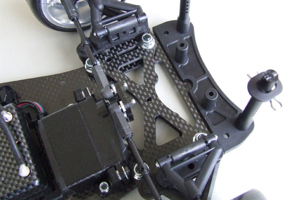 【主要装備】■カーボン製シャーシ(t=2.5mm) ■カーボンロアサスアーム(インディペンデントサス)■0°, 5°の2種類のアッパーアームマウント ■デルリン削り出しピボットボール ■オイルダンパー(ピッチング) ■チューブダンパー(ロール制御) ■アルミ削り出しモーターマウント(R)※左側は高剛性樹脂製 ■ボールデフ ■フルボールベアリング