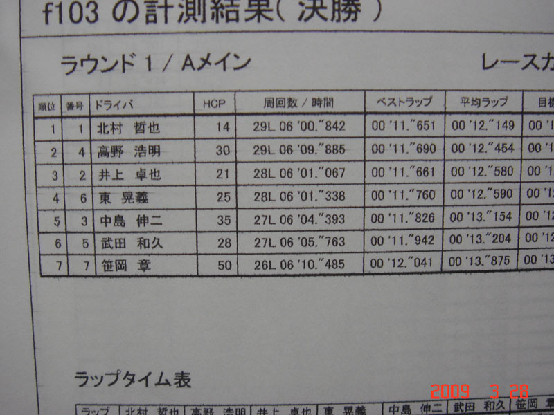 F103ベストラップ順の決勝の結果(決勝は周回レース)