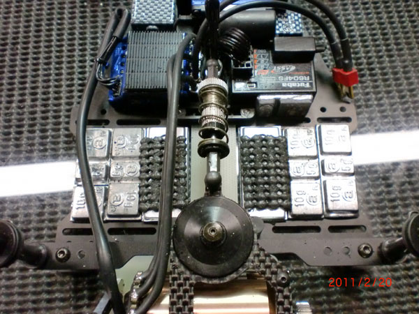 いろいろ工夫してウエイトを積みました。一番影響無さそうなバッテリーの下に仕込みました。
