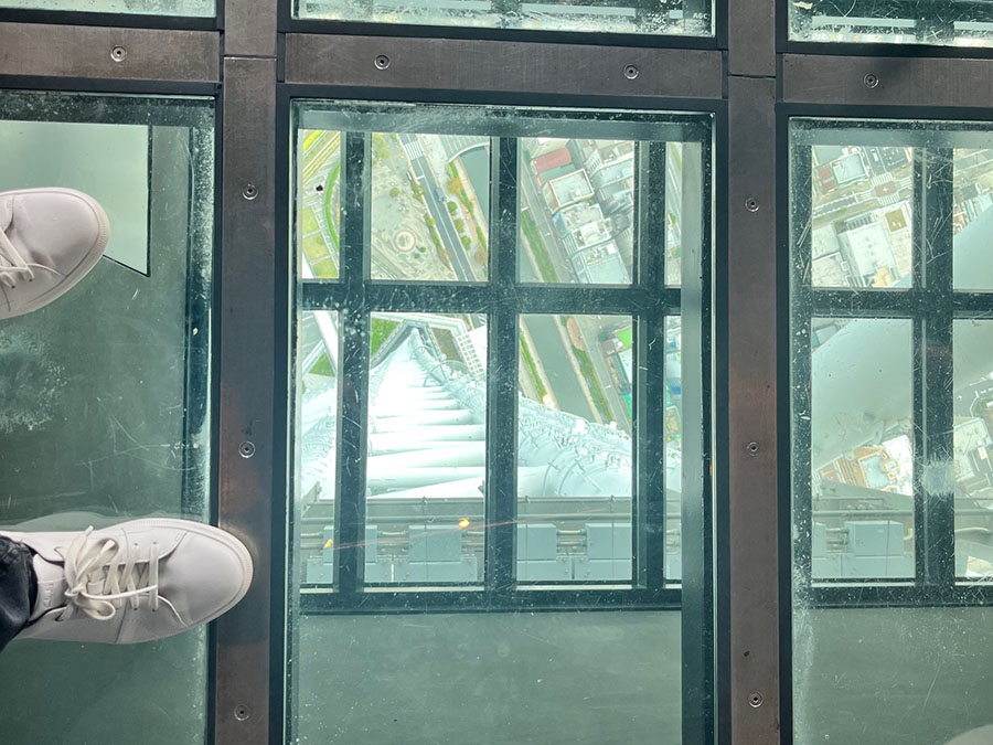お約束の高い建物にあるガラスの床コーナーもありました。